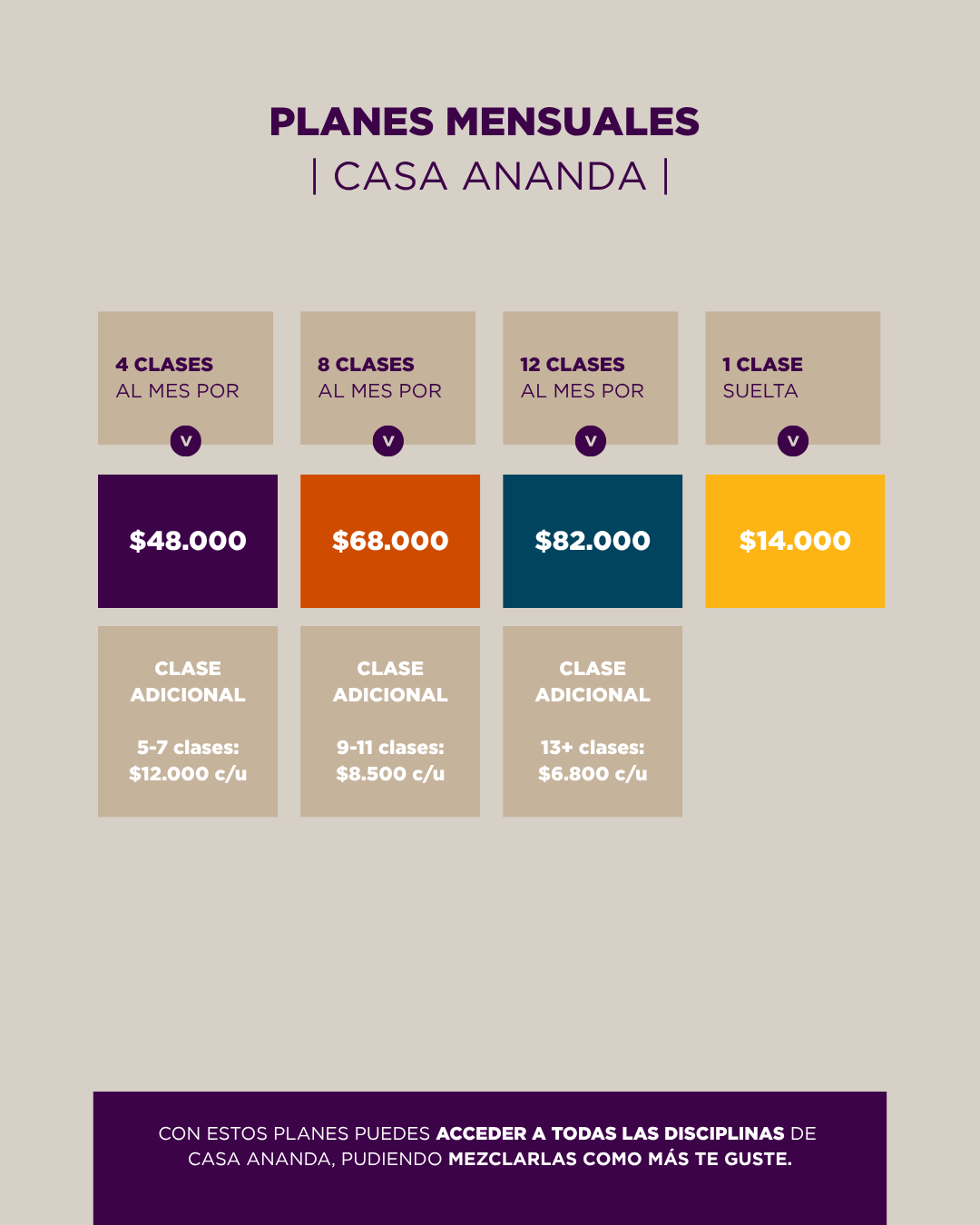 Con estos planes puedes acceder a todas las disciplinas de Casa Ananda, pudiendo mezclarlas como más te guste.